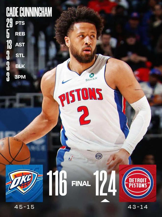 坎宁安29+13 活塞胜雷霆重夺联盟第一