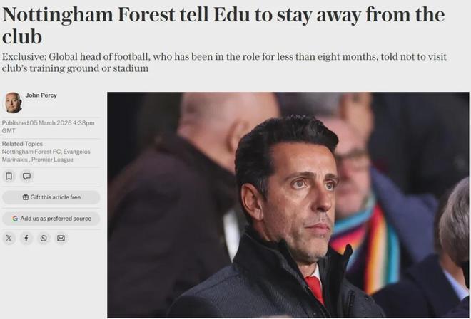 埃杜在森林就职还不到一年,但据悉这家俱乐部目前已经禁止埃杜踏上他们的训练场和球场。诺丁汉森林去年接近砸下2亿英镑,但本赛季他们已经4次换帅,且成绩不佳。